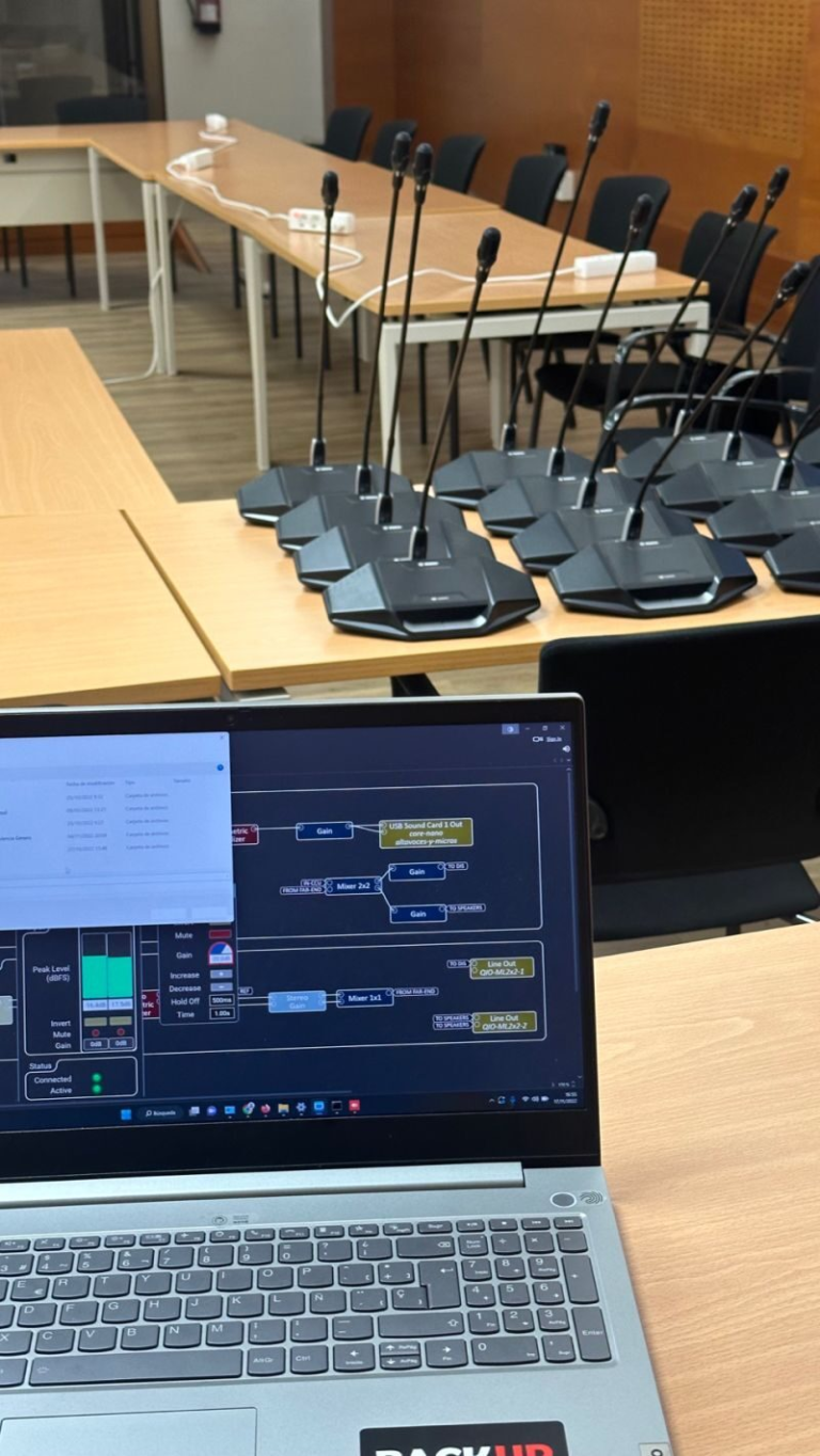 Finalizada la integración de los equipos audiovisuales en el aula de formación. Monitor PHILIPS de 86″, cámara PTZ ATLONA, 2 altavoces JBL C29 y 2 JBL C1, mezclador de audio ALESIS, microfonía SHURE SLXD4 de mano y diadema, con amplificador 4x100W de QSC y mezclador de vídeo Blackmagic ATEM Mini PRO para realizar doble realización.